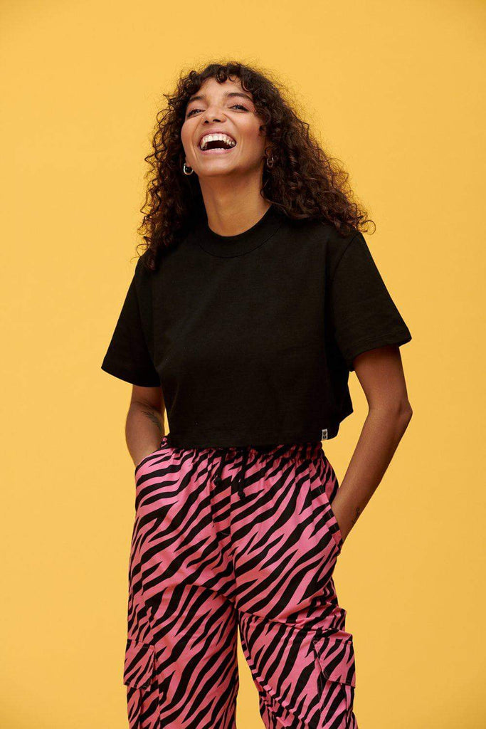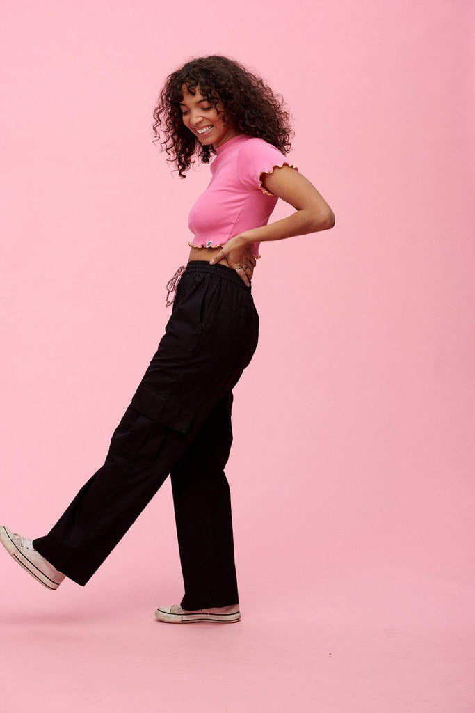 Matchu has gone wild - our super cool cargos now in black and pink Zebra Print! These guys have a sturdy elasticated high waist with a drawstring tie. Generous straight leg and six pockets! Two at the hip, two on the leg and two at the back.