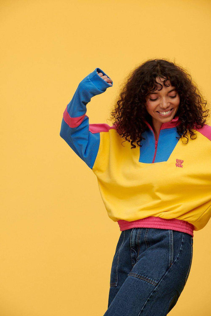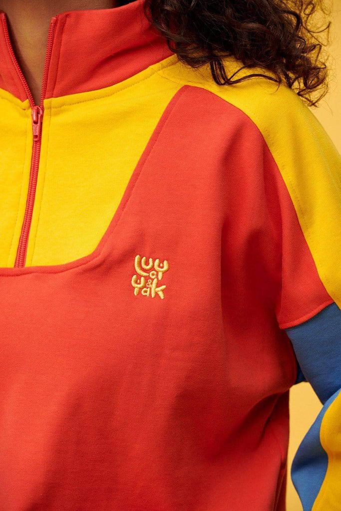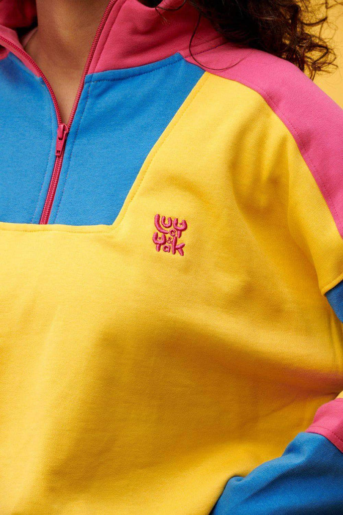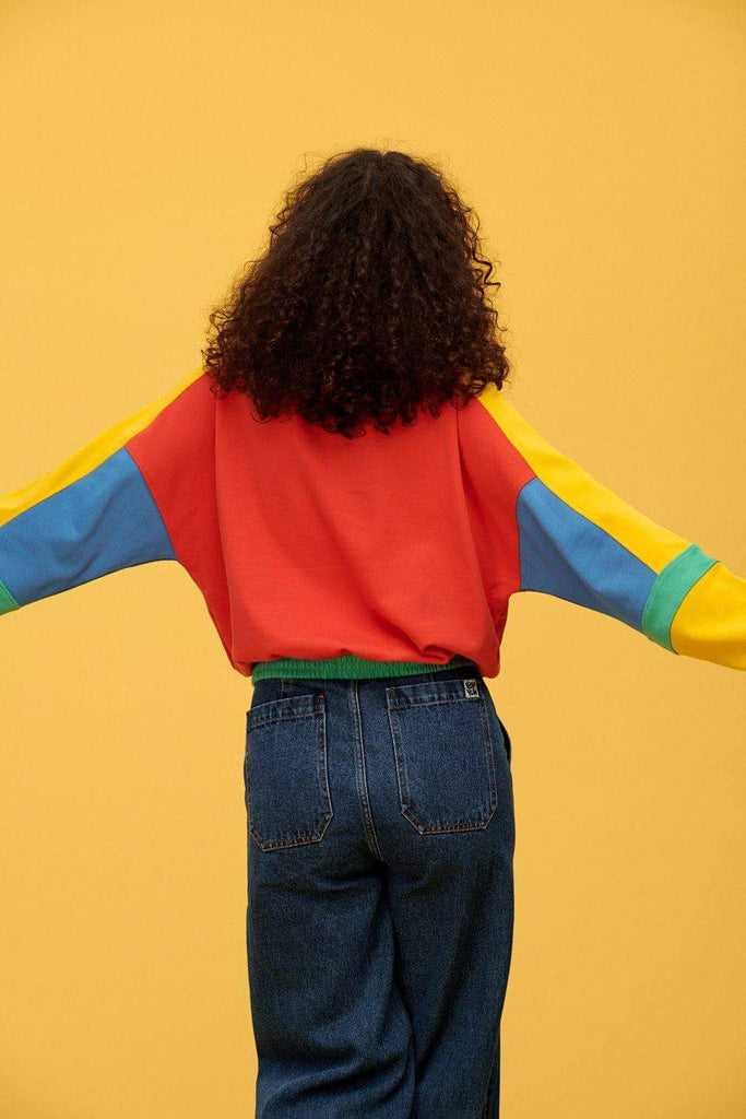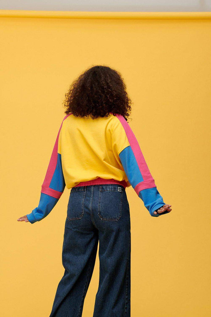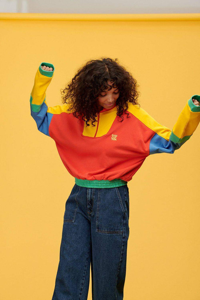 Our panelled sweatshirt giving out retro vibes left, right and centre! Relaxed pullover shape with zip up funnel neck. Drop shoulder raglan sleeves, long and cosy with cuffs at the wrists. Elasticated bottom hem, slightly cropped length. Made from 100% GOTS approved organic cotton.