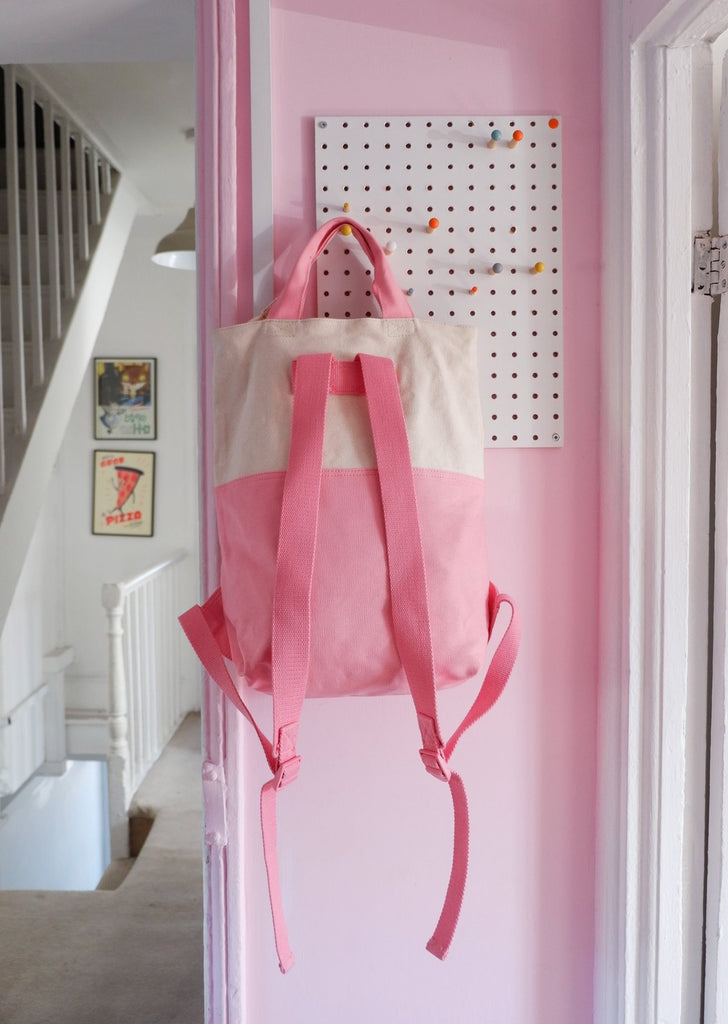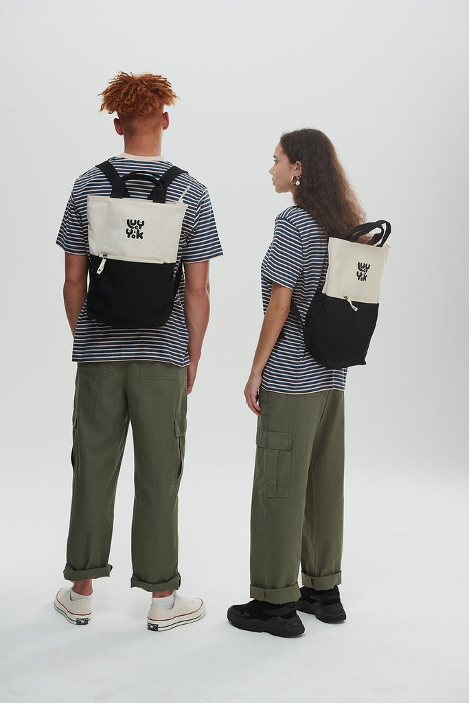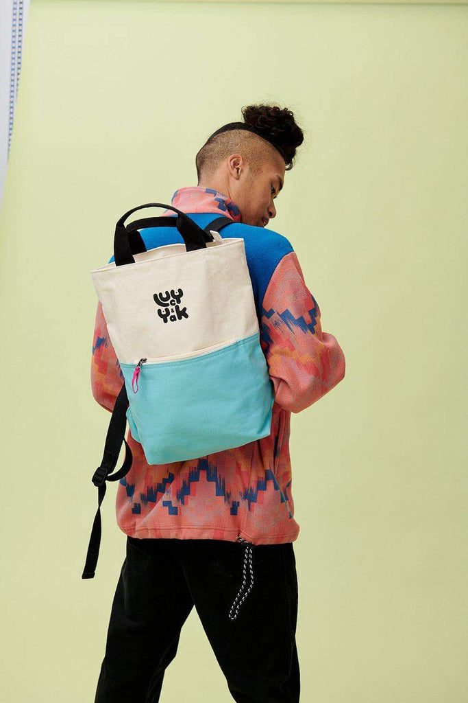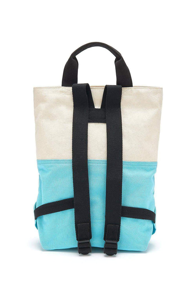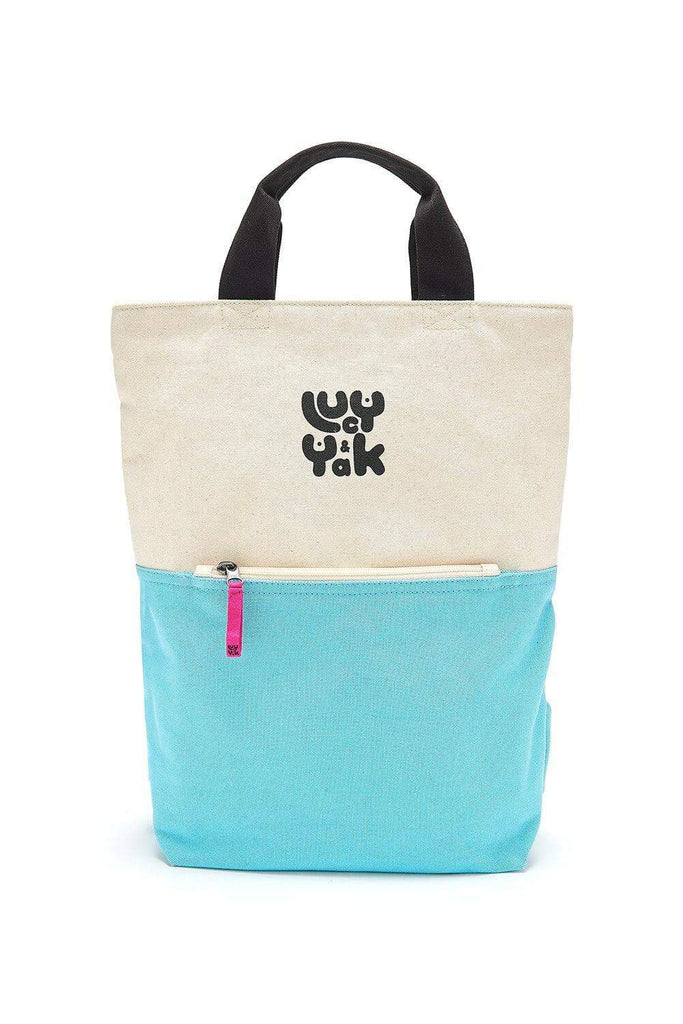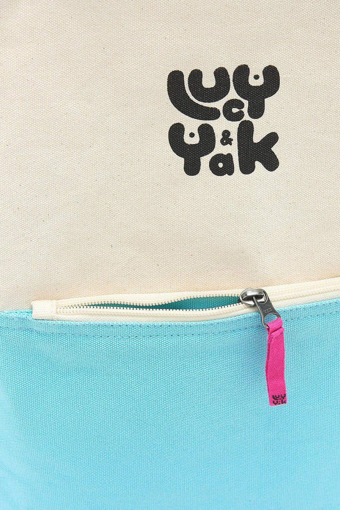 The Lucy & Yak Signature Backpack. Raw high quality Organic Cotton Canvas Backpack with natural un-dyed top half and contrasting Pale Blue bottom. Black carry handle and adjustable black straps.