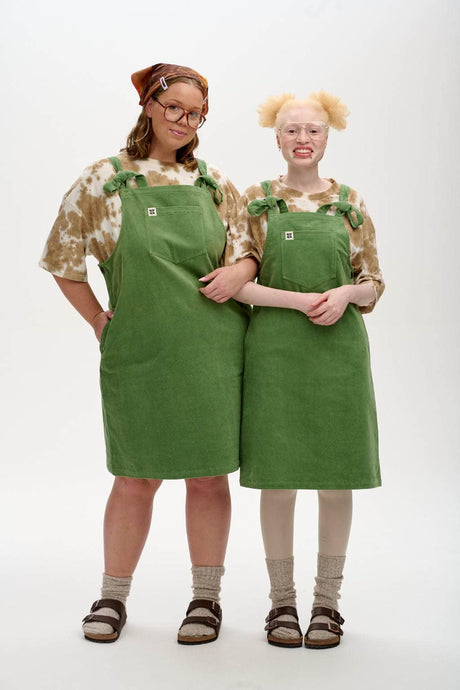 The Freyja Midi Corduroy Dungaree Dress. Our classic dungaree dress shape but in a longer a-line cut. With our signature straps, buttons at the hip, and pockets!