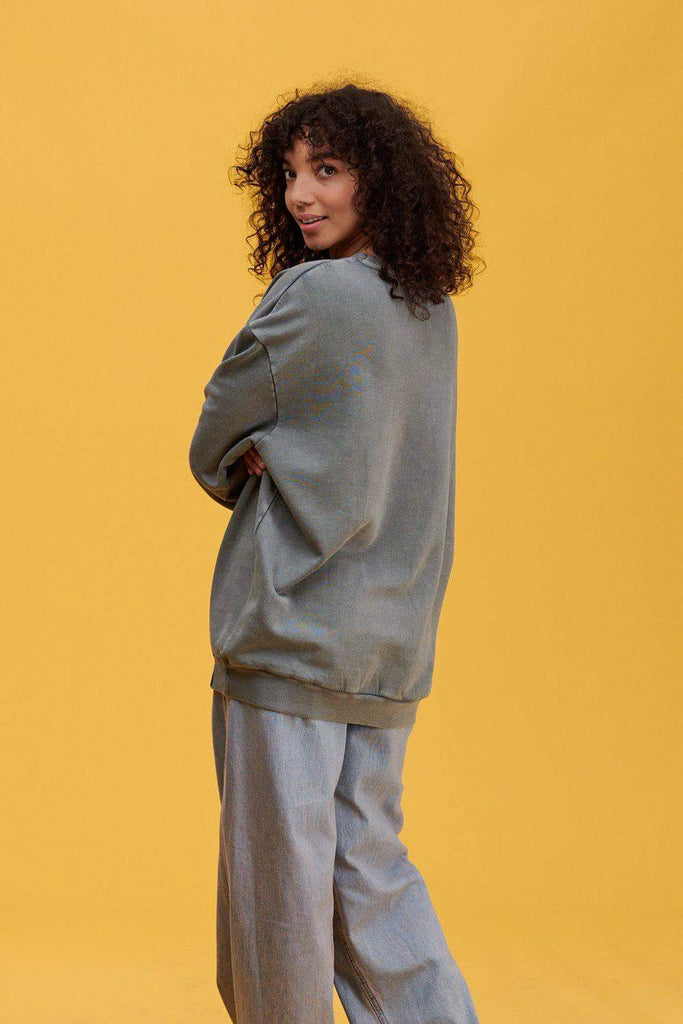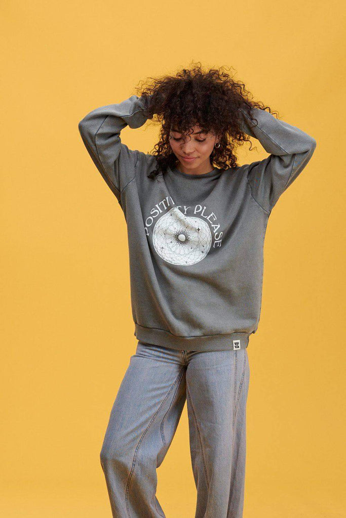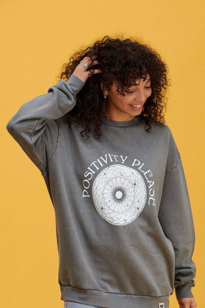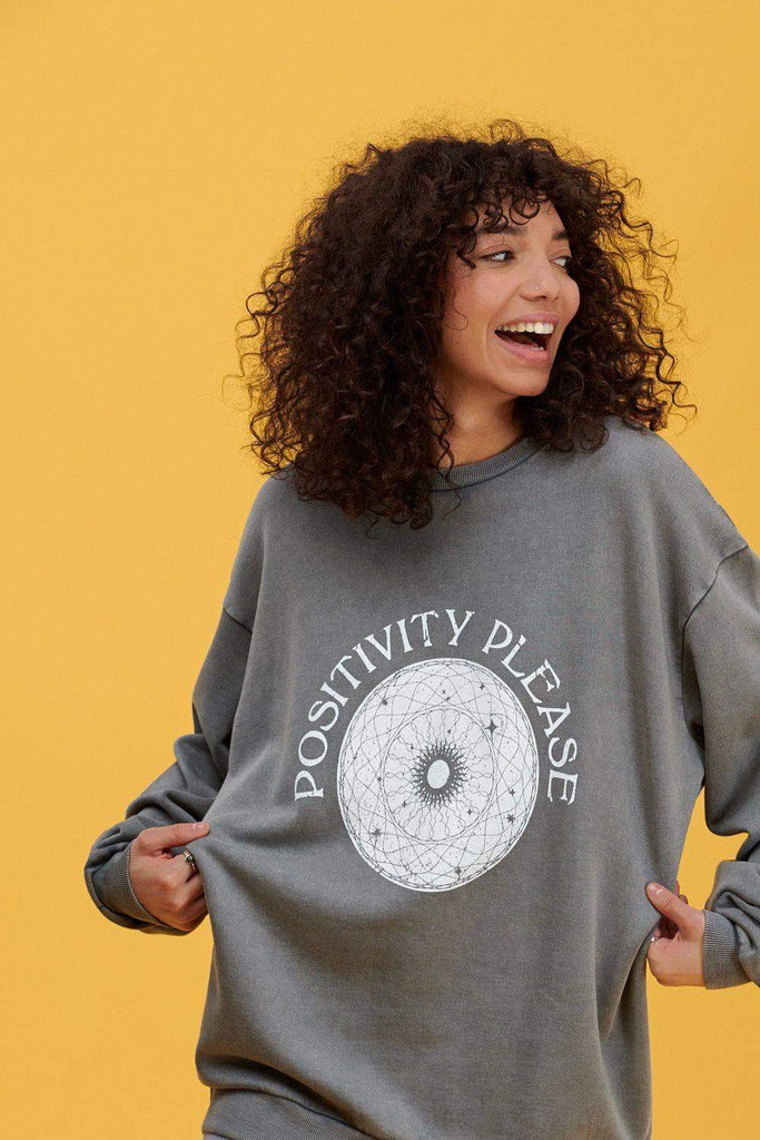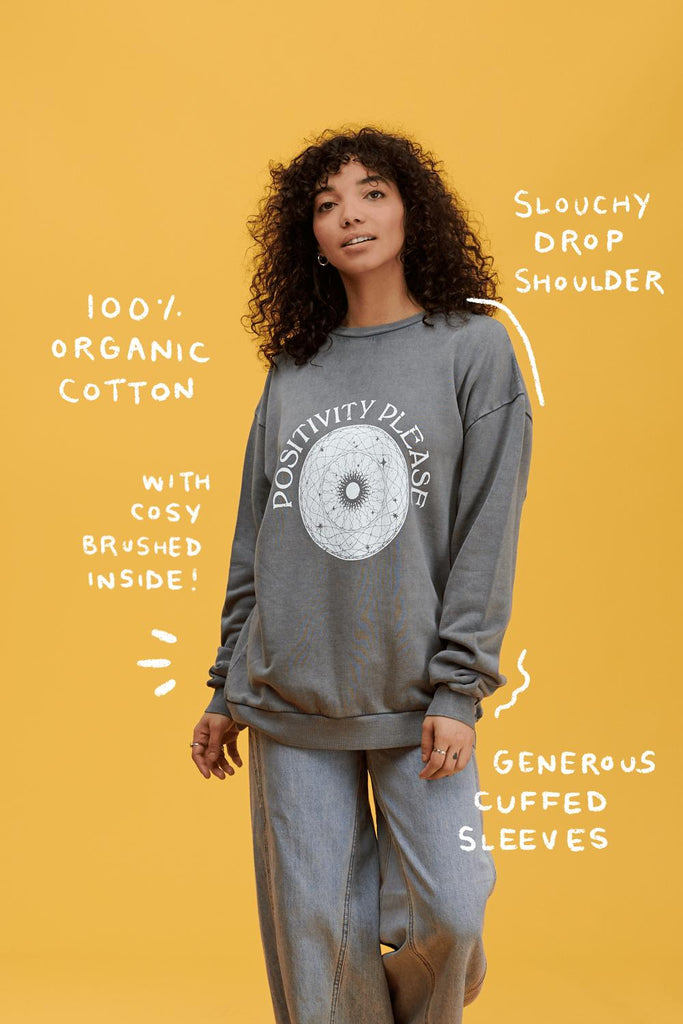 Our wonderful Sonny Sweater is back, this time in a beautiful soft charcoal grey with a lovely printed design requesting that dose of positivity - from the people reading your sweatshirt? from the universe? is it too much to ask for both!?